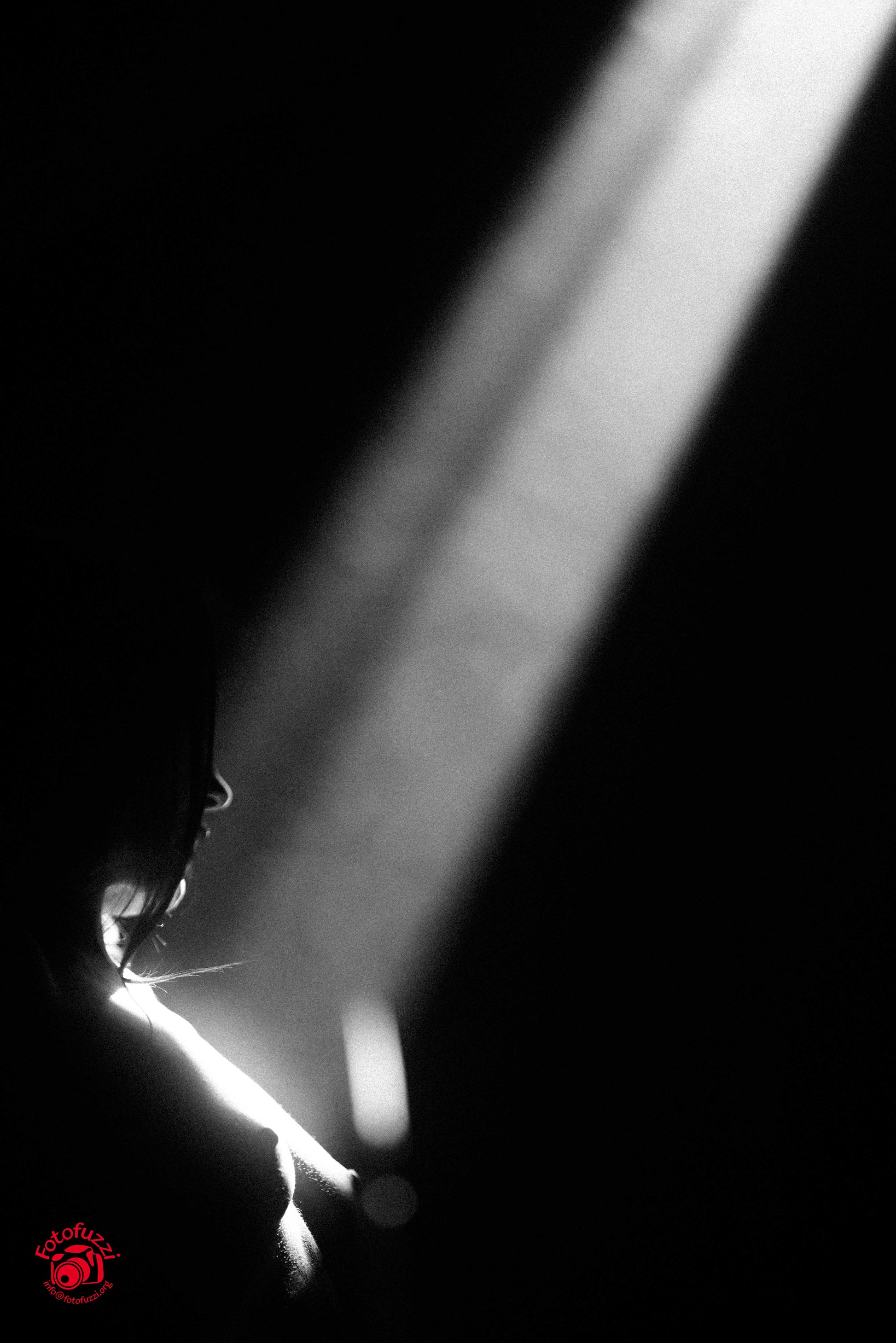 Die Silhouette der Person ist weich und geheimnisvoll, ein Hauch von Details – vielleicht eine Haarsträhne oder die Konturen des Gesichts – werden durch den Kontrast von Licht und Dunkelheit nur angedeutet. Das Bild spielt mit dem Element der Isolation, gleichzeitig aber auch mit der Erhebung. Der Lichtstrahl scheint den Moment zu entheiligen, als ob er die Person in eine andere Dimension oder in eine meditative Trance versetzt.