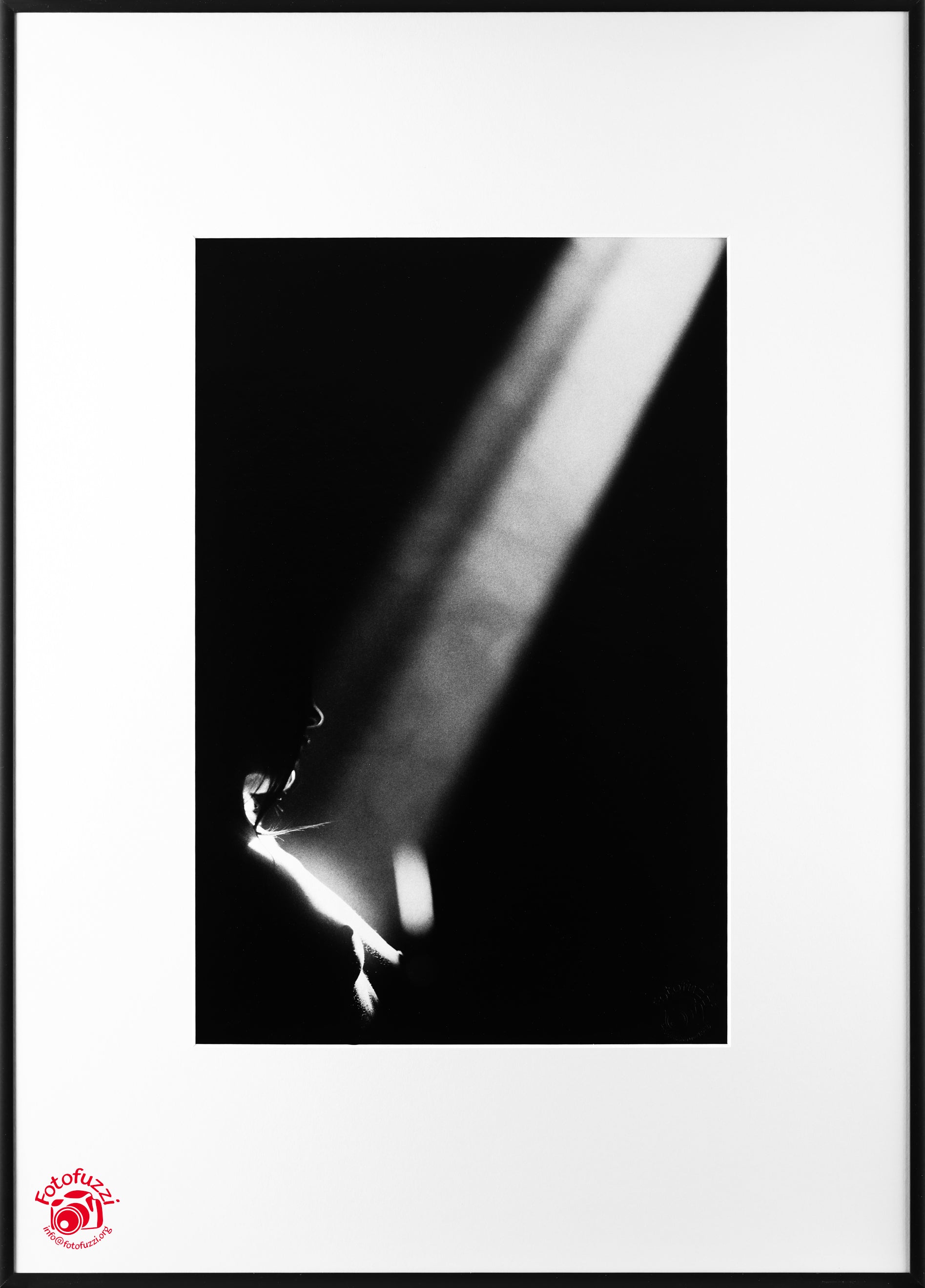 Die Schwarz-Weiß-Aufnahme verstärkt den dramatischen Effekt, da sie die Klarheit und Schärfe des Lichtstrahls im Kontrast zum dunklen Hintergrund betont. Die feinen Grautöne, die den Raum zwischen Licht und Schatten ausfüllen, verleihen dem Bild eine fast träumerische Atmosphäre, als ob die Zeit in diesem Moment eingefroren ist.